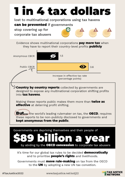 RT @TaxJusticeNet: Gov'ts are depriving themselves and their people of $89bn in corporate tax a year by abiding by the OECD concession to keep corporate tax abusers' data anonymous. 1 of every 4 tax dollars lost can be prevented by making #CBCR data public. #TaxJustice2022