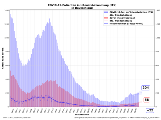 Belegung der #ITS mit COVID-19-Patienten mit Angabe zu invasiv Beatmeten und Neuaufnahmen.