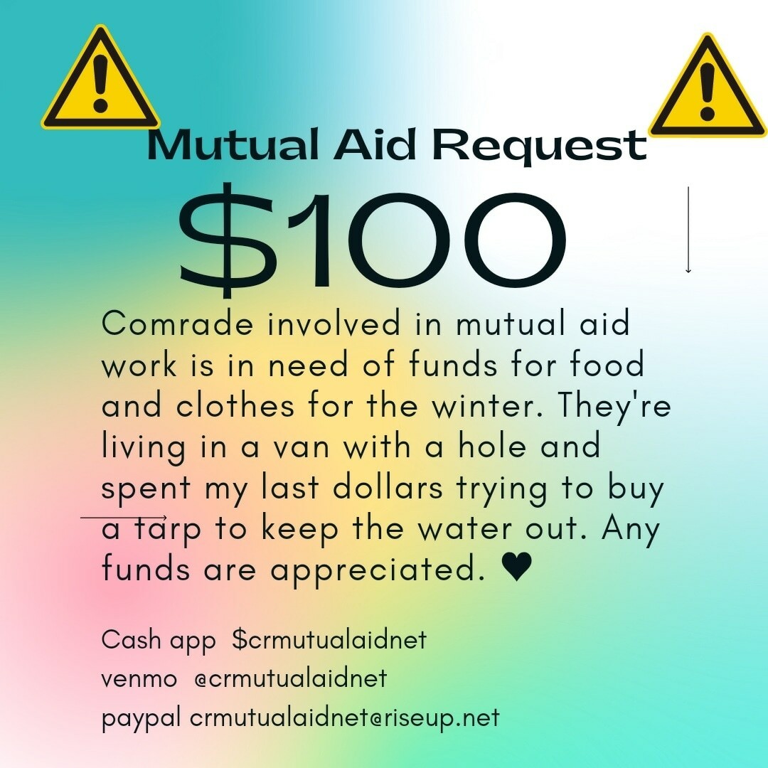 Comrade involved in mutual aid work is in need of funds for food and clothes for the winter. They're living in a van with a hole and spent my last dollars trying to buy a tarp to keep the water out. Any funds are appreciated. ♥️