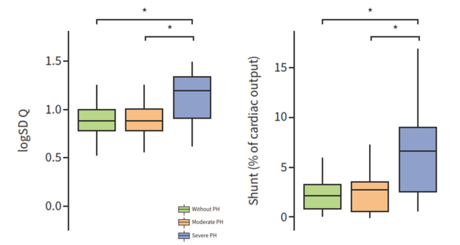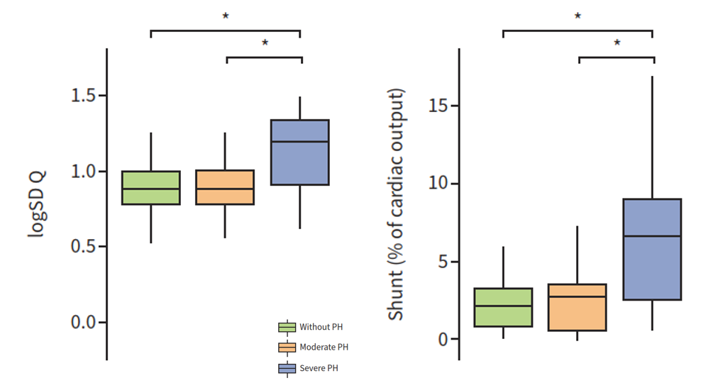 COPD pts w severe PH had worse Q dispersion (=Q variability, shown by higher LogSDQ, DISP R-E & curves not overlapping) and increased shunt (blood that is not in contact with air spaces).