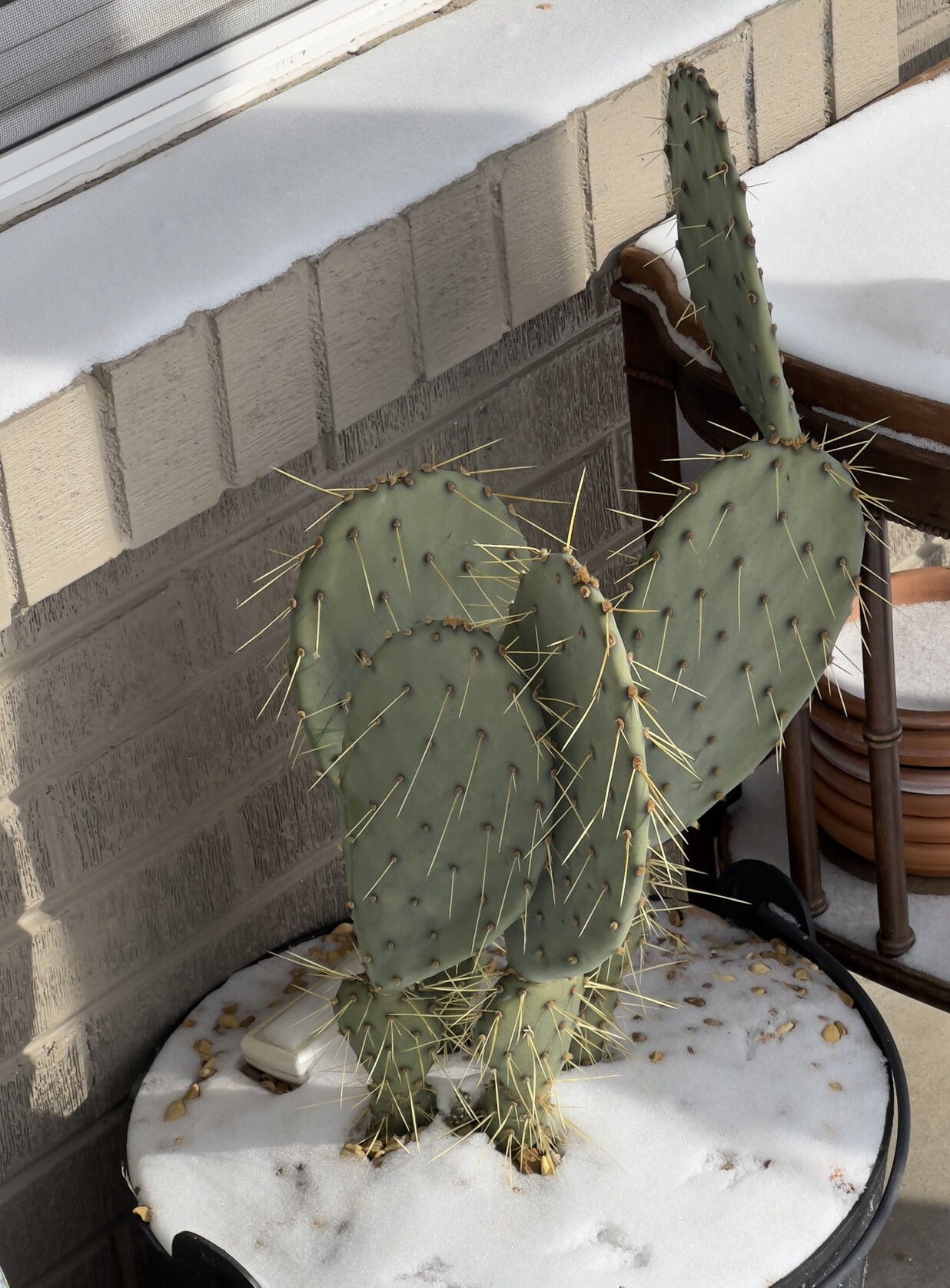 This is the first winter outdoors for Big Tuna, our Opuntia humifusa (Eastern Prickly Pear). Years ago, just as we became obsessed with cactuses, we were delighted to notice a large opuntia decked with snow in a local yard. They were tickled we liked it and gave us some pads to propagate.