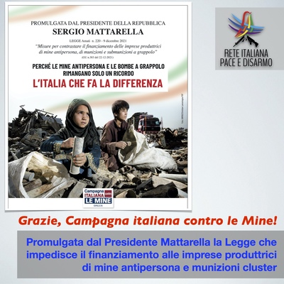 Promulgata la Legge contro il finanziamento ai produttori di mine antipersona e munizioni cluster https://retepacedisarmo.org/2022/promulgata-legge-contro-finanziamento-mine-antipersona-munizioni-cluster/?utm_source=rss&utm_medium=rss&utm_campaign=promulgata-legge-contro-finanziamento-mine-antipersona-munizioni-cluster #CampagnaItalianacontroleMine #ReteItalianaPaceDisarmo #Munizionicluster #S...