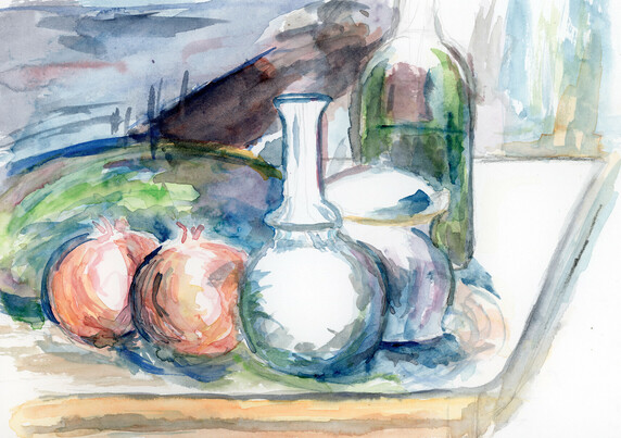 A copy of Cezanne's "Still Life with Fruit, Carafe, Sugar Bowl, and Bottle" that I made in the summer of 2021.