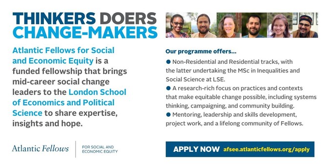📢Calling all social change leaders! Start your #changemaker journey now by applying to the fully-funded Atlantic Fellows for Social and Economic Equity programme at @LSEInequalities@twitter.com!