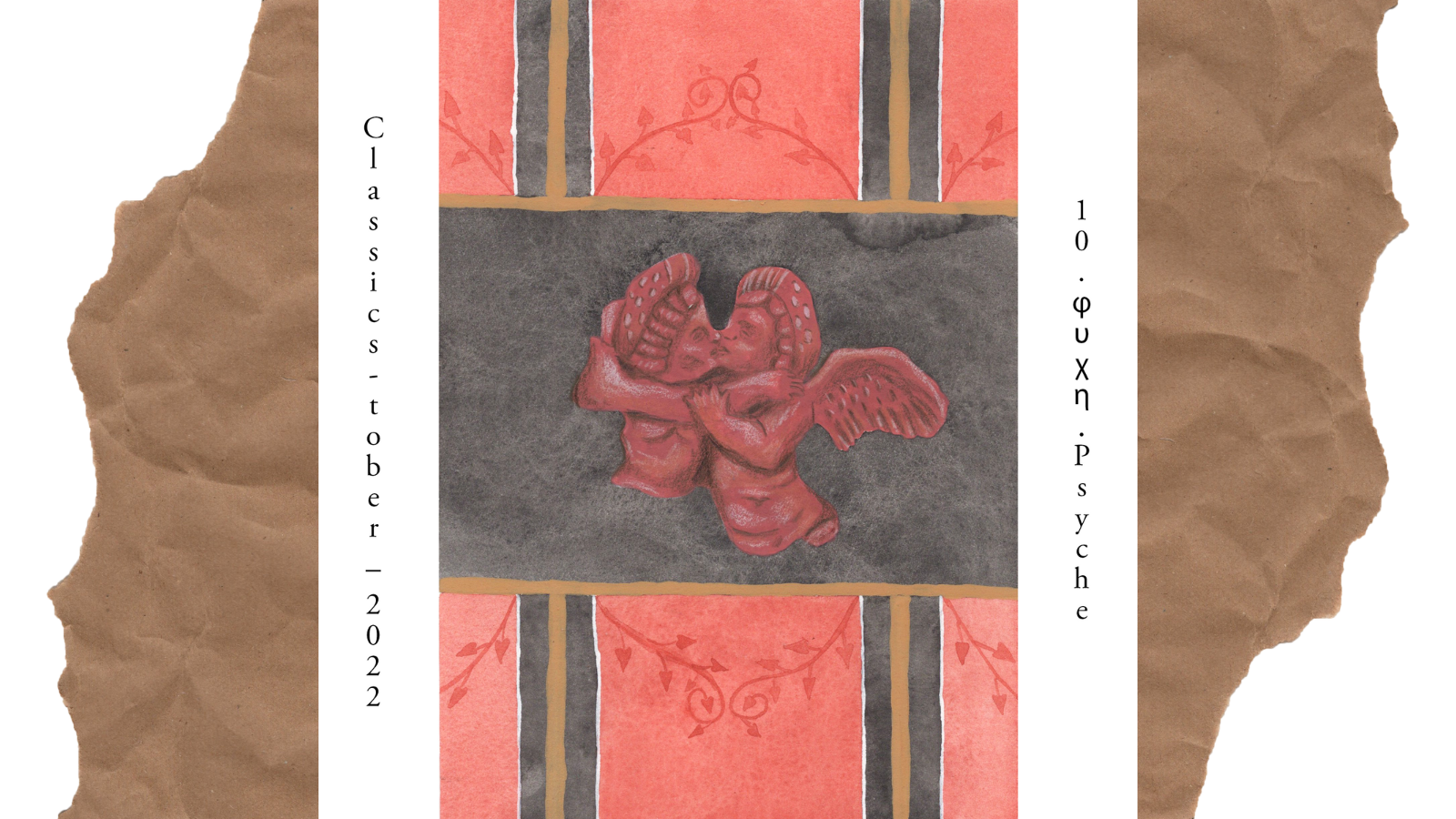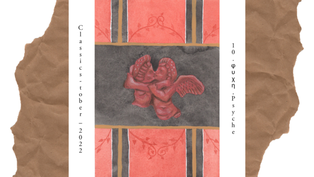 Classicstober 10 ψυχή (Psyche). (repost from Twitter and a favourite of mine!) | I’ve gone for a mixture of a Psyche and Cupid statuette and the framing of a Psyche and Cupid frieze from the House of the Vettii. Gouache, watercolour, and coloured pencil on watercolour paper.