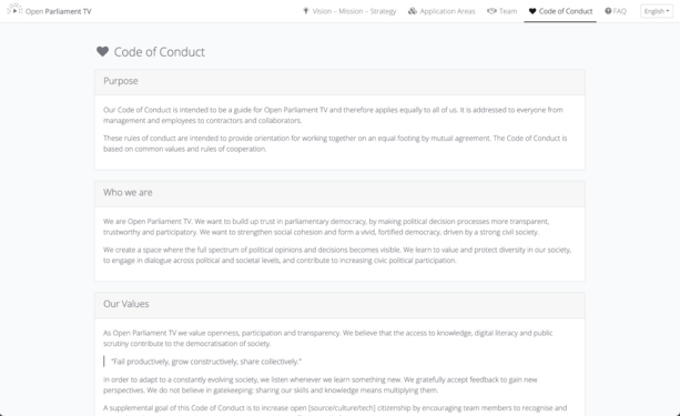 We are happy to share our 💚 #CodeOfConduct 💚 which we developed over the last months and which will shape our future work on Open Parliament TV: https://openparliament.tv/code-of-conduct