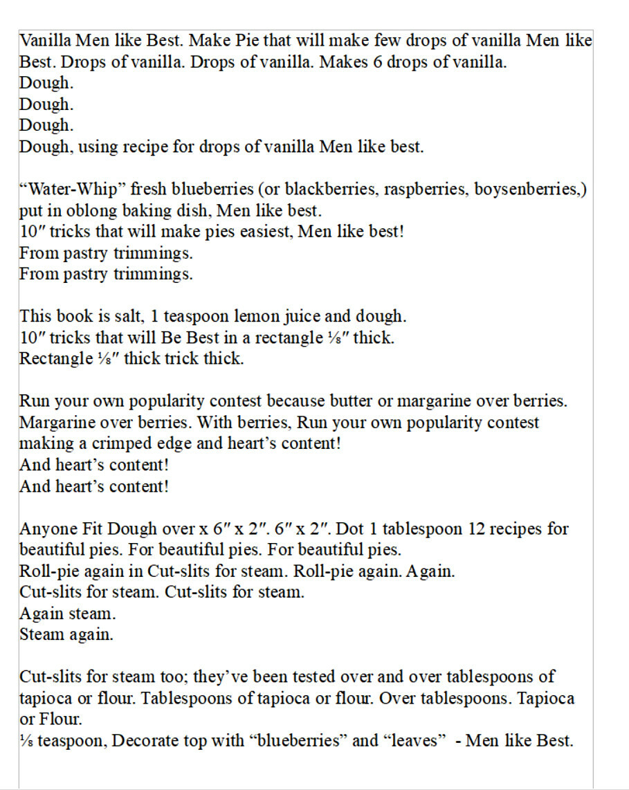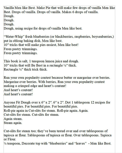 #ProjectGutenberg have many interesting #books. Besides the classics, there are a vast number that offer a window into #Culture, #Values, #Beliefs, & #ideologies. One recent addition is, 12 #Pies #Husbands Like Best ~ Aunt Jenny's Recipe Book. The #Title alone reveals #TargetAudience and #GenderRoles. I thought I would have some fun with these #recipes, and turn them into #Dadaist #Poetry. Here is Dadaist #Recipe #Pie #Poem 1. #Dada #Dadaism #ProsePoem #CollagePoem #Absurdist