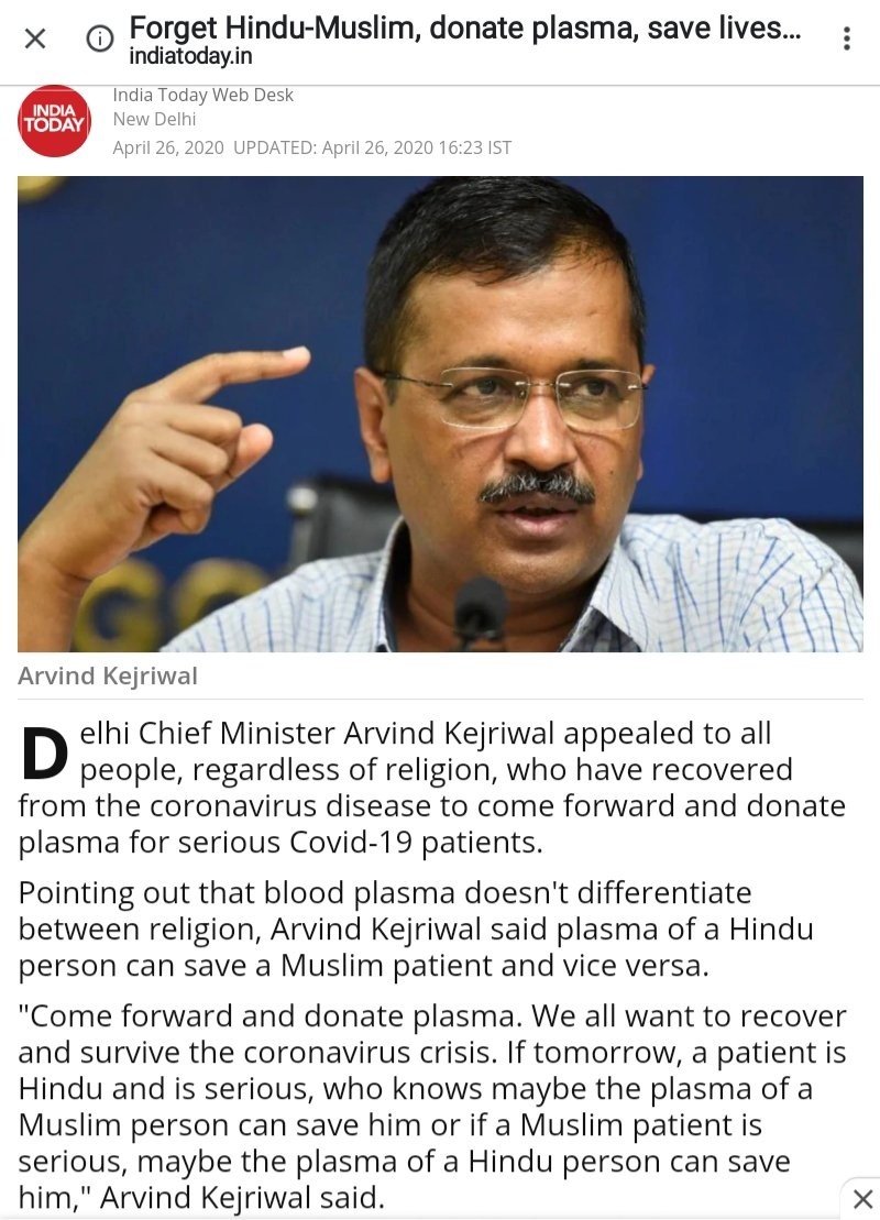 Kejriwal who helped BJP-RSS with #CommunalVirus & special "Markaz Cases" to find scapegoats, now accepts offers of help from Tablighi Jamaat, saying that blood plasma does not differentiate between religions