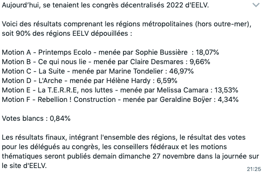 à propos des résultats du #congrèsEELV, la participation est faible et si la désaffection des citoyen•nes pour les partis politiques traditionnels n’est pas propre à #EELV en son sein même l’intérêt pour la vie interne du parti concerne à peine 50% des adhérent•es