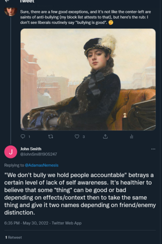 Sure, there are a few good exceptions, and it's not like the center-left are saints of anti-bullying (my block list attests to that), but here's the rub: I don't see liberals routinely say "bullying is good". 🤔