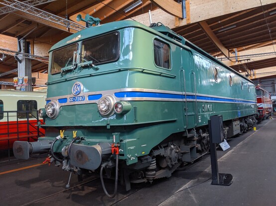 French electric locomotives CC 7107 (left) and BB 9904 (right) at the Cite du Train, Mulhouse, France. These two locomotives jointly set the world railway speed record at 331 kph (206 mph) in March 1955. This remained the record for a locomotive hauled train until 2006!