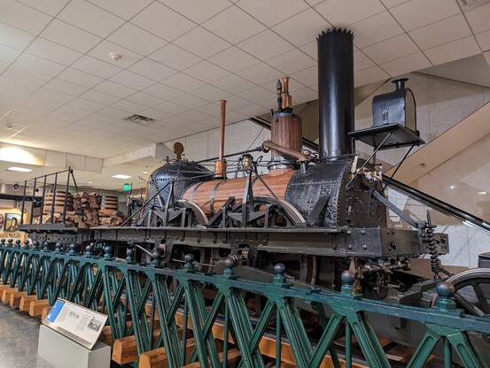 The John Bull, the oldest intact locomotive in the Americas. Built originally by Robert Stevenson in 1831 as a similar 0-4-0 "luggage locomotive" to what was used on the Liverpool & Manchester, it was significantly modified by the Camden & Amboy (of New Jersey) into a 2+2-2-0 by removing the connecting rods and adding floating pony truck with cowcatcher.