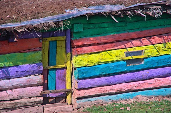 A bright and colorful house made of wood, in Gulmarg. These houses are used by shepherds and farmers in Gulmarg when it's not snowing. #kashmir #travel #photography #Cottage