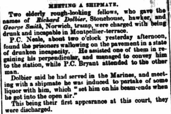 Poetic phrasing appears in this newspaper report on the proceedings at Cheltenham Police Court in 1862. A policeman assisted a drunk man in "regaining his perpendicular", while the prisoner, a former Marine, said the effect of going into the open air after a drinking session had "set him on his beam-ends". (Cheltenham Examiner, 15 Jan 1862. Image from British Newspaper Archive) #Cheltenham #Gloucestershire #CrimeHistory #History