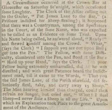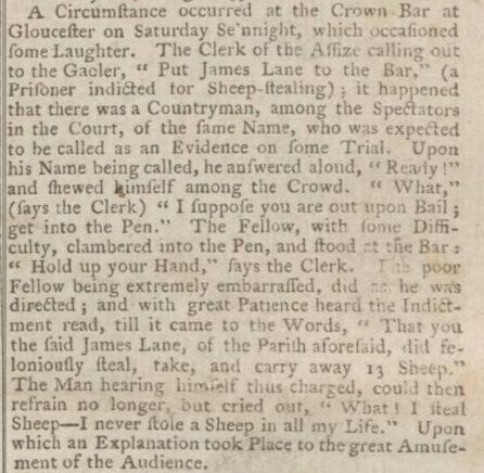 A witness mistaken for a defendant at the Gloucestershire Summer Assizes, 1783. (Northampton Mercury, 25 Aug 1783. Image from British Newspaper Archive.)