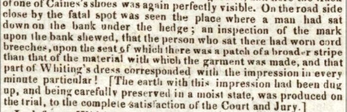 A lesson from history: If you are going to murder someone, don't sit down nearby and leave behind (sorry!) a perfect imprint of your patched corduroy breeches. Mark Whiting (wearer of the breeches) and James Caines were hanged for the murder of Isaac Gorden at Gloucester Prison. (Image from Bath Chronicle, 14 Apr 1825, courtesy of British Newspaper Archive.) #Gloucestershire #CrimeHistory
