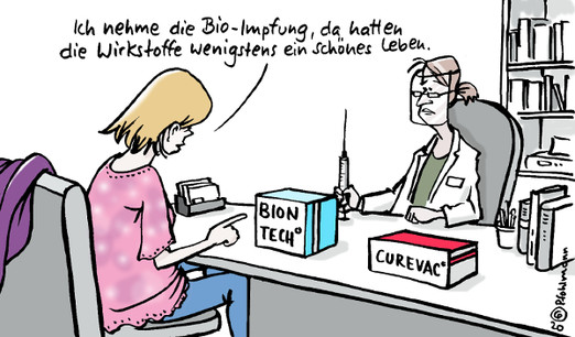 #corona #coronavirus #pandemie #impfung #impfen #impfstoff #bio #öko #biontech #curevac #forschung #pharma #tierhaltung #arzt #ärztin #medizin #gesundheit #krankheit #karikatur #cartoon (c) www.pfohlmann.de