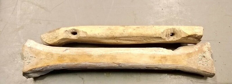 Modified horse metapodials, drilled with holes to attach a shoe above and polish from skating, in the zooarchaeology collection at the University of Groningen