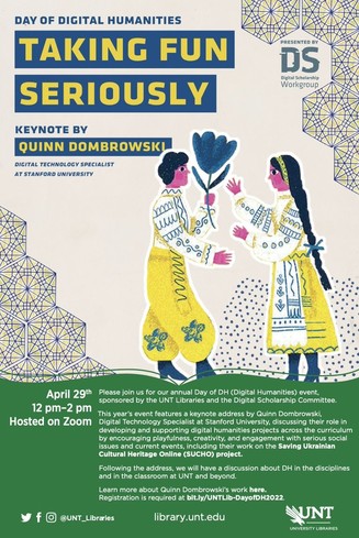 For some bonus #DayofDH2022 tomorrow, I'll be talking about taking fun seriously at @UNT_Libraries@twitter.com. It should be quite a journey ranging from the #DataSittersClub, #DHRPG, and fanfic, to Ukrainian web archiving, and... ducks 🦆🦆🦆. Zoom sign-up at https://bit.ly/UNTLib-DayofDH2022