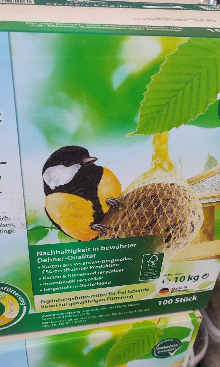 Im Dehner Gartencenter gibts Meisenknödel mit Nachhaltigkeitsanspruch: Karton, Klebeband und Innenbeutel scheinen recycelbar (was eh unmöglich ist).