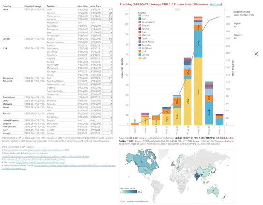 Tracking #SARSCoV2 lineage XBB.1.16 + NS3_V13L over time - Globally