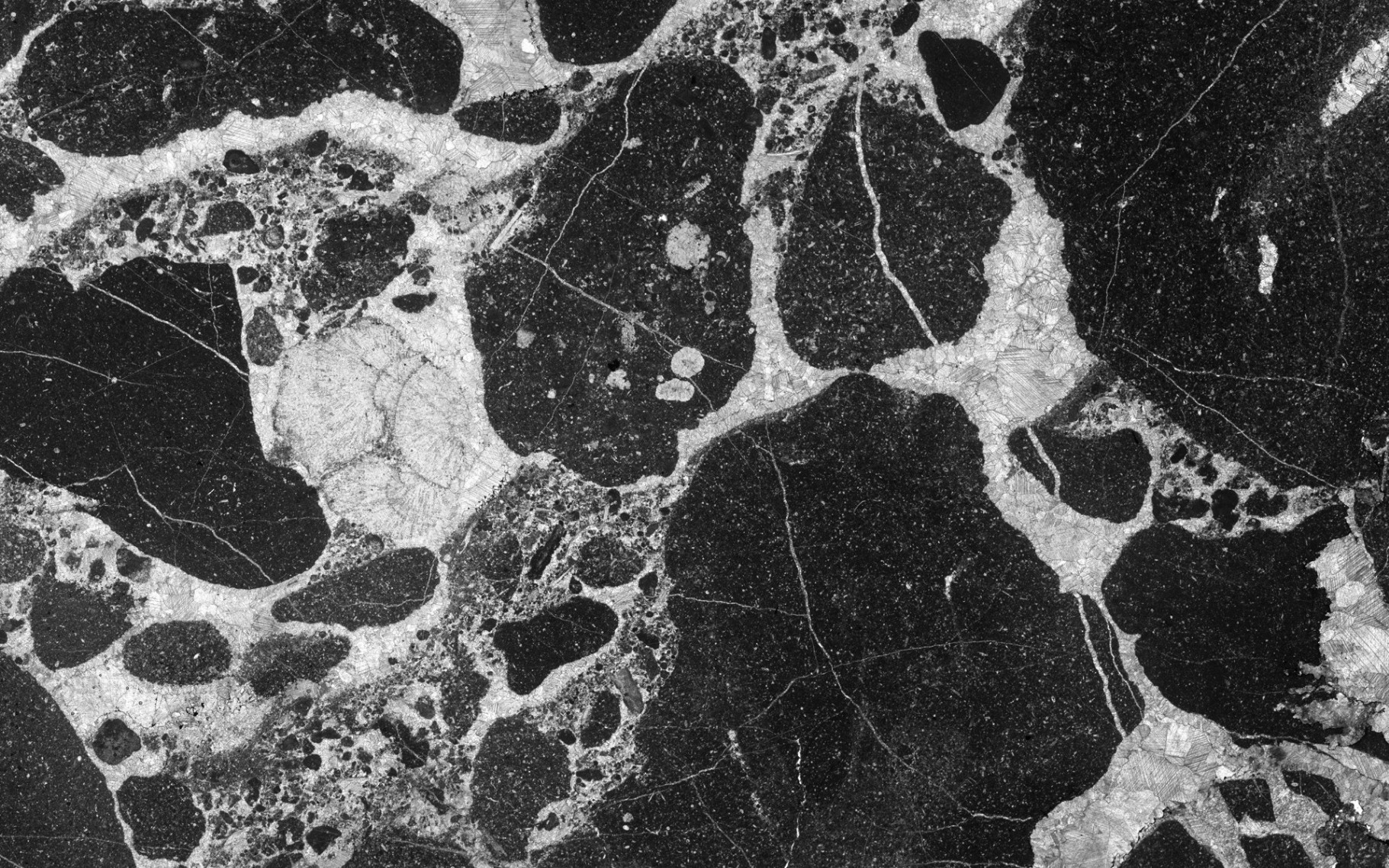 Hierfür wird eine hier 5 x 5 cm messende Gesteinsprobe auf einen Glasträger geklebt und dann auf ca. 0,05 mm Dicke heruntergeschliffen. Dabei wird sie durchscheinend und kann mittels Durchlichtmikroskop untersucht werden. Neben der mineralischen und ggf. fossilen Zusammensetzung erkennt man so auch feinste Strukturen.