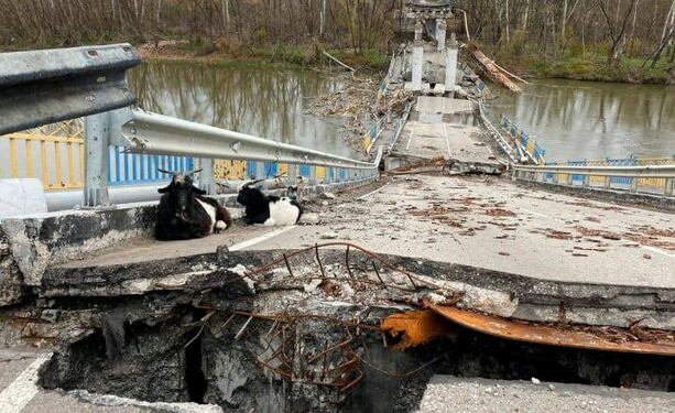Was intrigued to find this photograph of a destroyed #Ukrainian bridge with 2 goats.