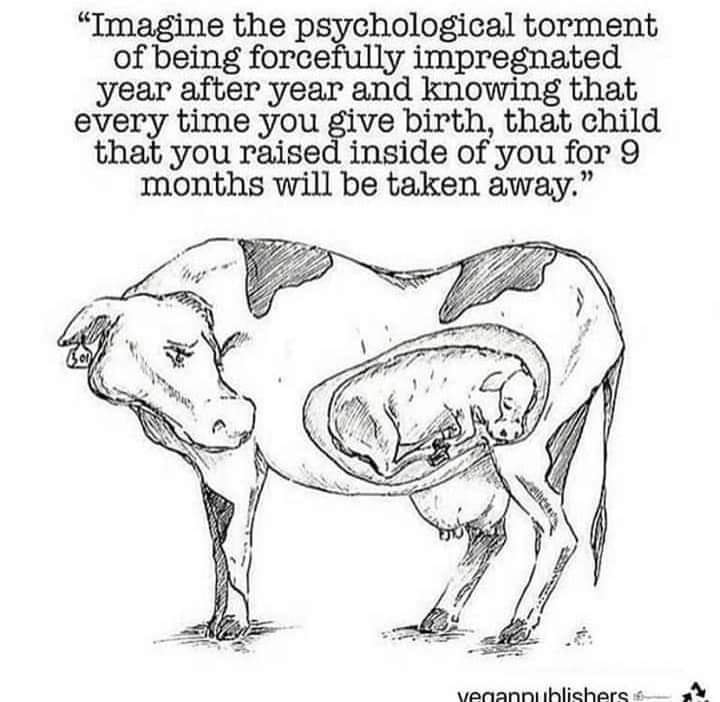 Cows are breed into existence through rape (artificial insemination). An existence of torture, suffering, exploitation, and an extremely early and unnecessary death. These mothers repeatedly have their babies stolen from them moments after birth so adults of a different species can steal it. Both mother and child cry out in confusion and sorrow for each other for weeks. #DitchDairy #GoVegan #VegetariansSupportCruelty #Milk #Dairy #DairyIsScary #DairyIndustry #NotYourMilk