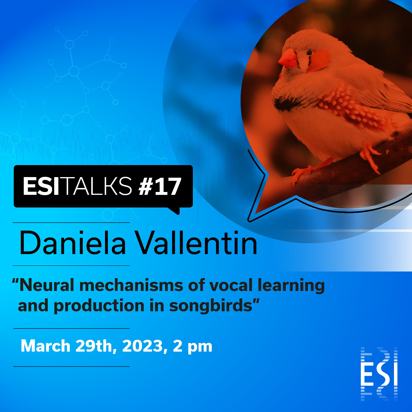 Join us tomorrow for the next #ESItalks in person and online with Daniela Vallentin from @MPIforBI talking about songbirds and the neural mechanisms of vocal learning 🐦🎶