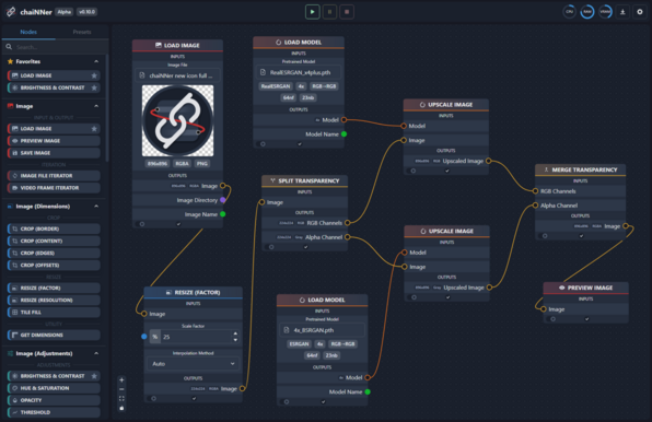 If you haven't heard about chaiNNer yet it an amazing node based application that allows you to feed images (or iterate over folders of images) and use premade models to upscale or do image processing automatically. It's so easy and the UI is amazing to use. It also can get dependencies like pytorch and other things with a click of a button.