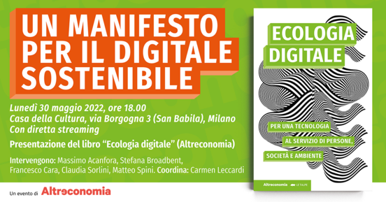 Se siete a Milano lunedì prossimo e vi interessano le alternative sostenibili, aperte e libere alla tecnocrazia che controlla le nostre vite, potete partecipare alla presentazione del libro #EcologiaDigitale, alle 18 nella Casa della Cultura di via Borgogna 3.