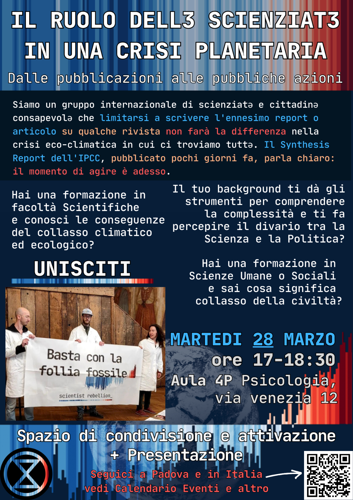 🔥 Inoltre, presenteremo il movimento Scientist Rebellion, discuteremo sul ruolo di scienziatз e cittadinз nel contesto dell'emergenza climatica ed esploreremo modi per attivarci. Avremo l'opportunità di ascoltare testimonianze dirette di attivistз dall'Italia e dall'estero.