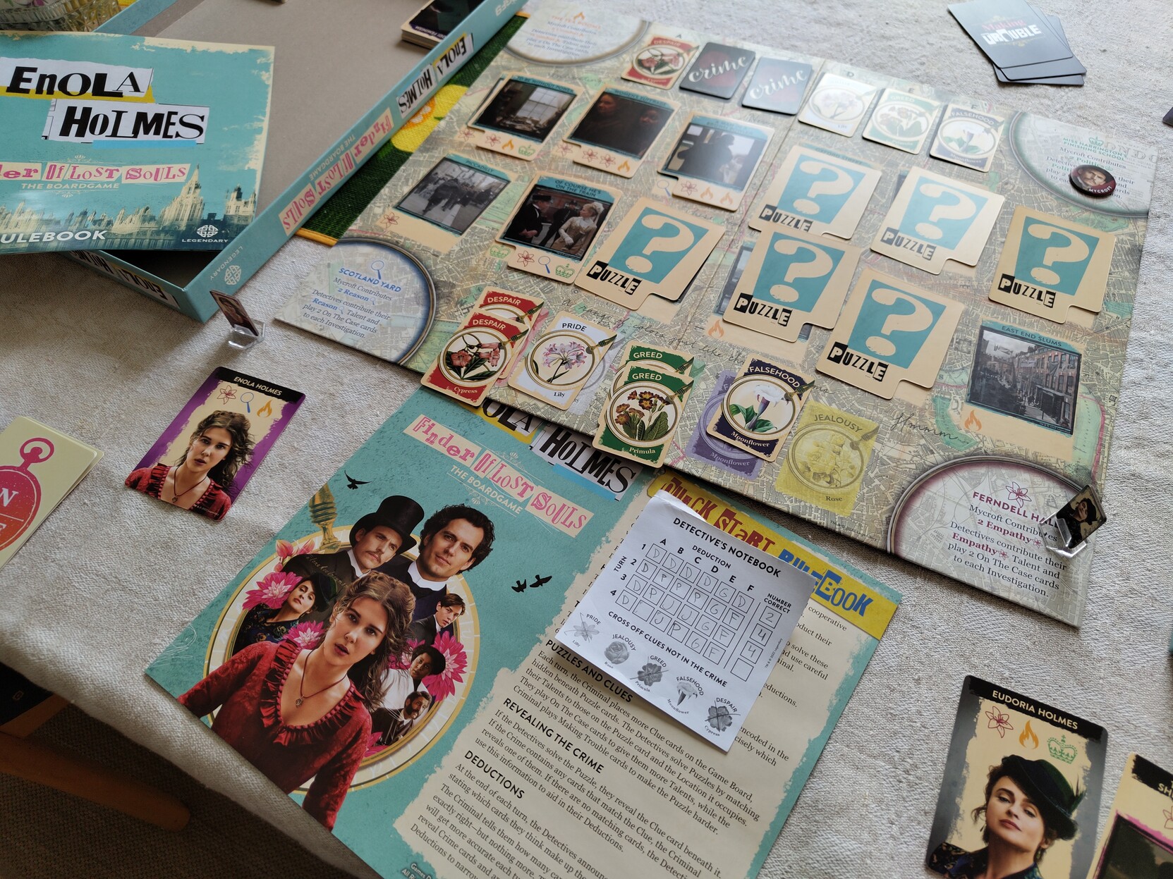 Solving crimes with #EnolaHolmes, Finder of lost souls. It's an ok #boardgame, some deduction involved (Mastermind style) and a bit of strategy needed for the criminal, but otherwise I wasn't too blown away. Theme is cool, I enjoyed the movies more. #boardgames