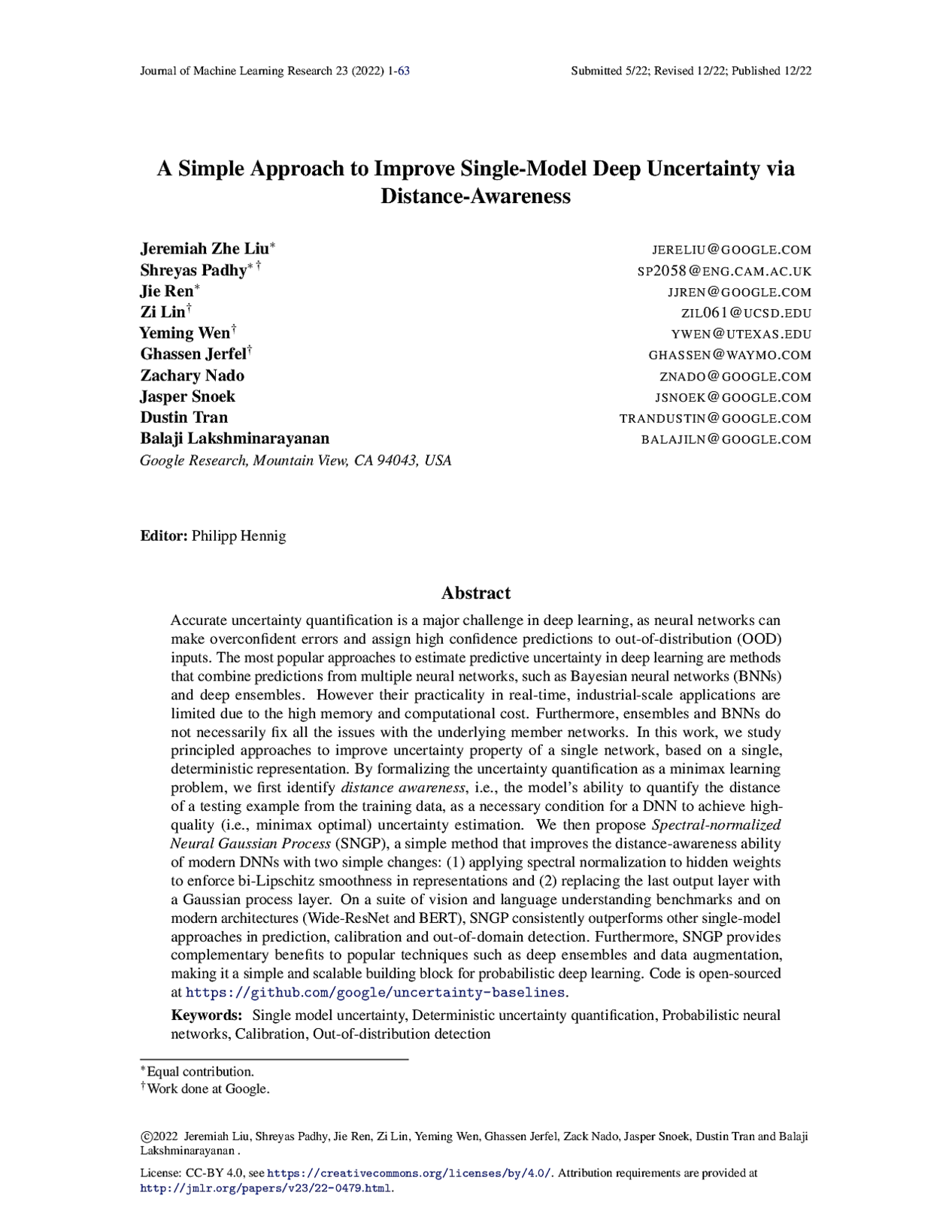 'A Simple Approach to Improve Single-Model Deep Uncertainty via Distance-Awareness', by Jeremiah Zhe Liu et al.
