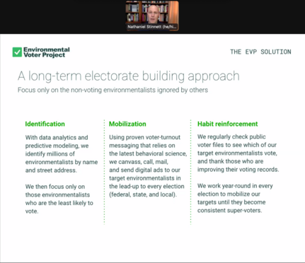 #EnvironmentalVoterProject theory of change. Identification, Mobilization, Habit reinforcement.