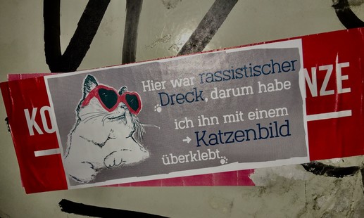 Gestern wollte ich die roten Aufkleber noch abreißen, aber es waren zu viele Leute unterwegs. Heute bin ich froh, dass ich keine Gelegenheit dazu hatte, weil ansonsten hätte ich diesen sehr geilen Aufkleber nicht entdecken können.