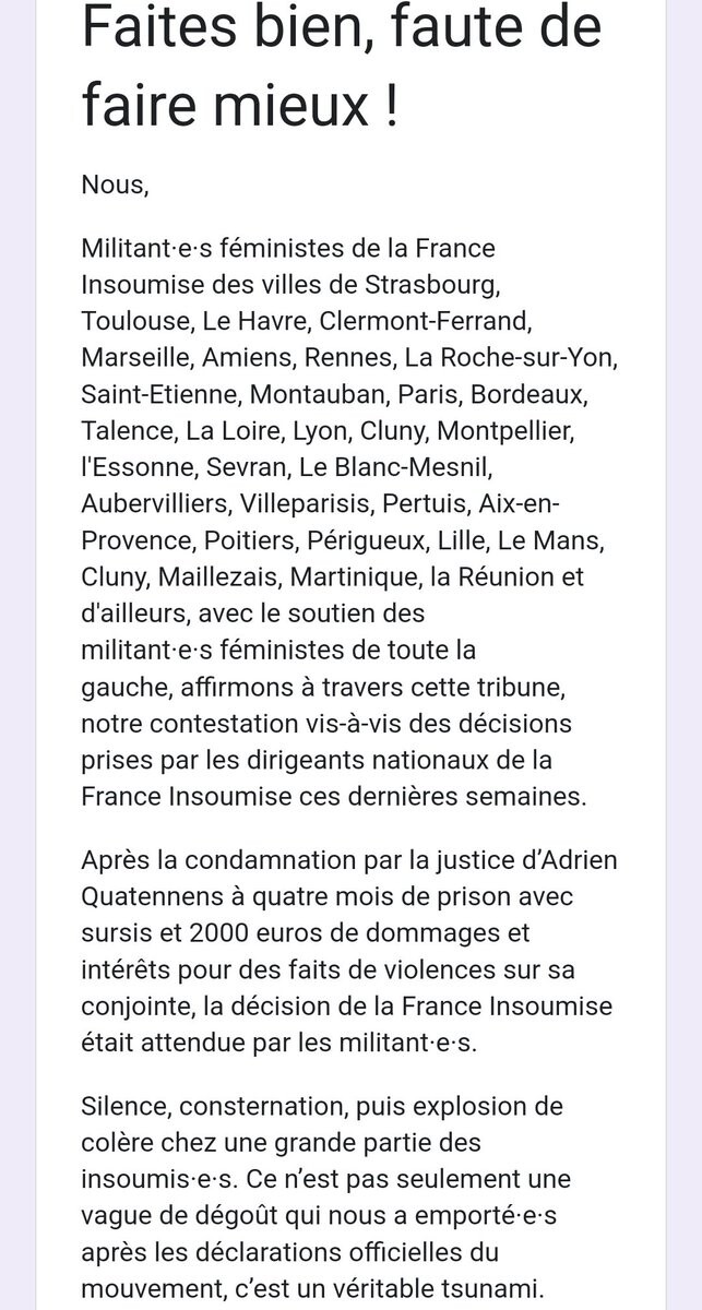 Voici la tribune que nous avons publié dans Le Monde, signée par plus de 1 000 militantes et militants de l'ensemble de la gauche, concernant l'affaire Quatennens. ⤵️
