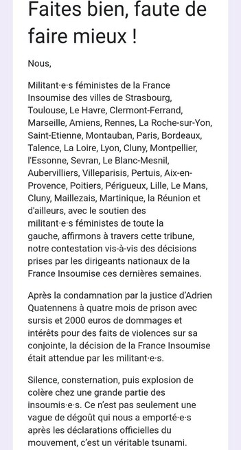 On aimerait bien discuter en interne de la FI de la question de Quatennens au lieu d'être contraint•e•s de sortir une tribune contre notre propre mouvement.