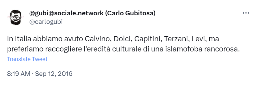 Questo dicevo nel 2016 sulla #Fallaci, questo confermo oggi nel 2023: In Italia abbiamo avuto Calvino, Dolci, Capitini, Terzani, Levi, ma preferiamo raccogliere l'eredità culturale di una islamofoba rancorosa.