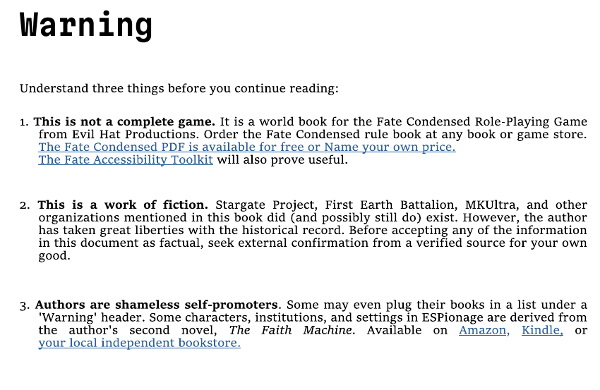 Introduction, page 2. This is some of the earliest text written for the ESPionage RPG. At a meeting of the Writers Coffeehouse with Jonathan Maberry, about beginning a project with a list of 12 things a project is. I split the difference and made a list of 6 things it was, and 6 things it wasn’t. That list turned into this intro. It might turn again into the back cover copy if we do physical prints.
