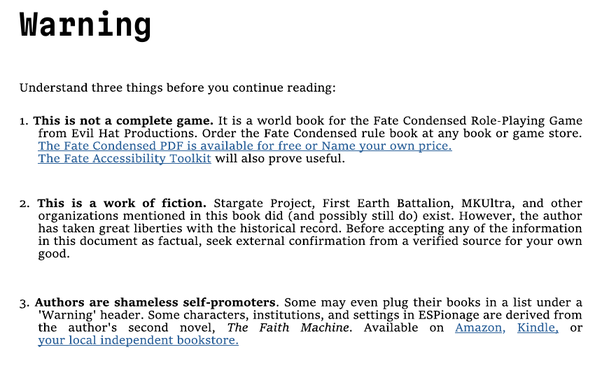1. I felt people should know they need to download the Fate Condensed rules to make this a complete game.