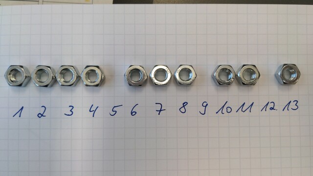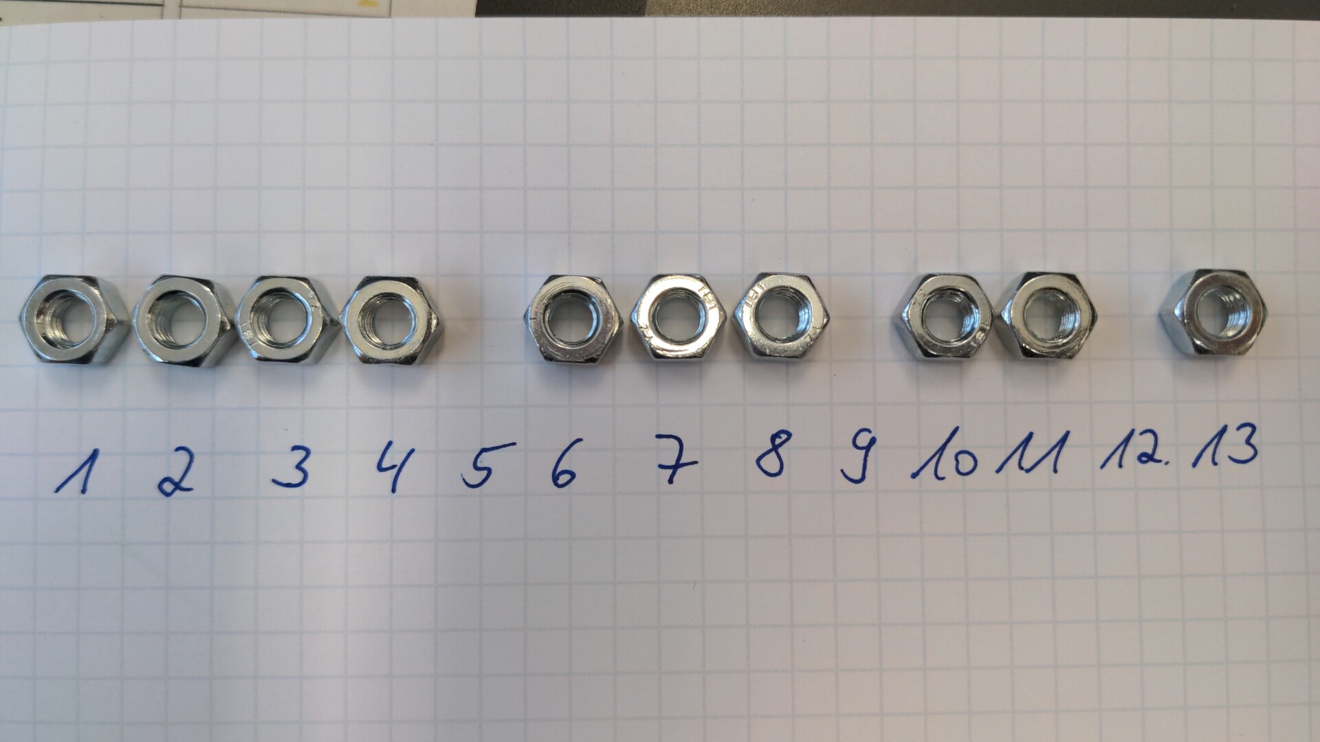 Ihr seht auf dem Bild von links nach rechts einmal 4 Muttern, dann 3 Muttern, dann 2 Muttern und 1 Mutter.