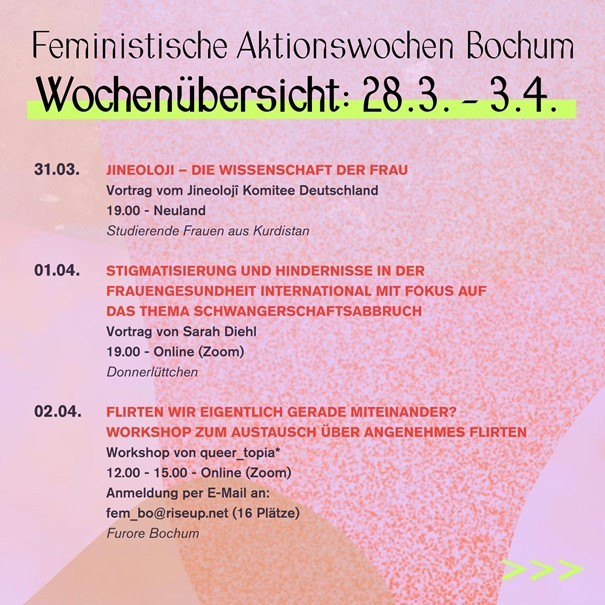 Weiter geht's bei den feministischen Aktionswochen #Bochum mit einer neuen Woche: 2 Vorträge & 2 Workshops stehen auf dem Programm - teils online, teils in Präsenz.