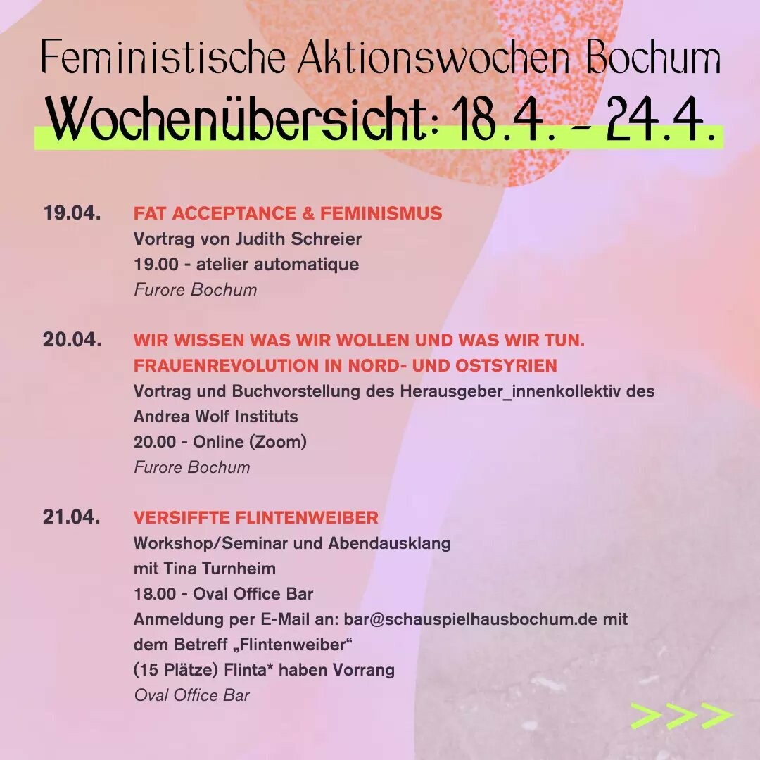 Und los geht's in eine neue Woche bei den feministischen Aktionswochen #Bochum. Schon heute Abend um 19 Uhr geht es los mit einem Vortrag von Judith Schreier zum Thema "Fat Acceptance & Feminismus" im atelier automatique.