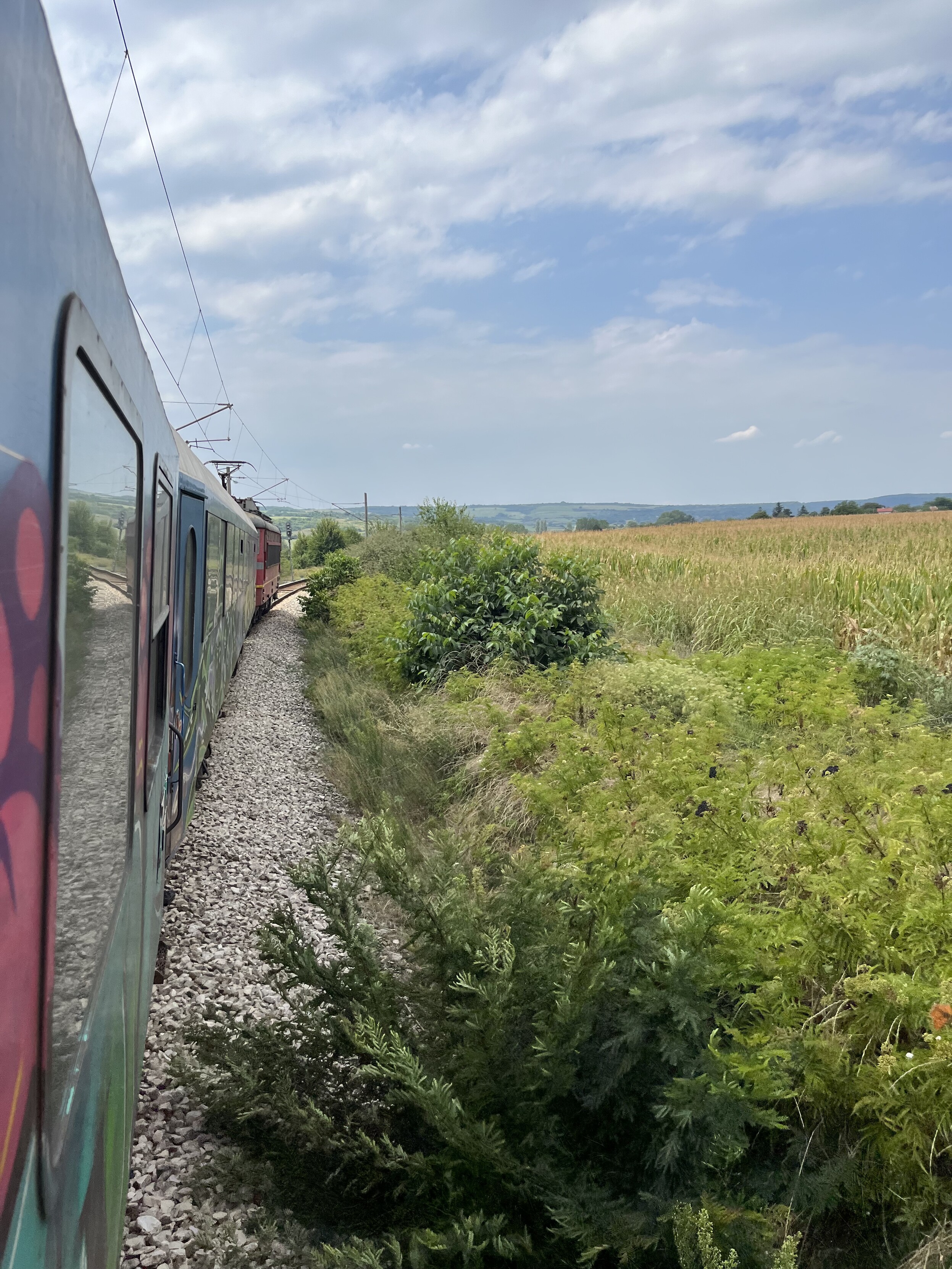 Symbolbild für entschleunigtes Reisen in Rumänien: Die Abteilnachbarn haben gerade während der Fahrt durch das #FensterAuf irgendwelche Sträucher gepflückt. 🚃🫳💐