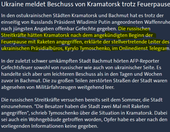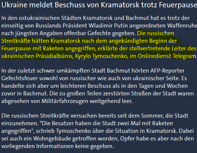 Nachtrag: #Russland brauch natürlich keinen Anlass, seitens der #Ukraine, um die #Feuerpause zu brechen. Sie beschießen #Kramatorsk und #Bakhmut auch trotz "Feuerpause"