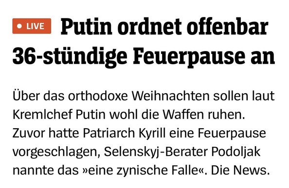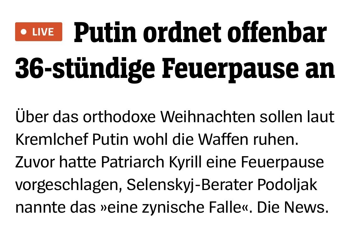 Ob die von #Putin angeregte #Feuerpause in der #Ukraine wohl auch etwas damit zu tun haben könnte, dass viele Soldaten am orthodoxen Weihnachtsfest mit ihren Familien telefonieren werden? Über Mobilfunk?