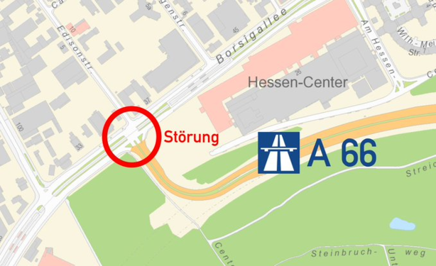 [von @Stadt_FFM "drüben"] #FfmVerkehr: Die Ampel an der Anschlussstelle Borsigallee (A 66) kann aktuell wegen eines Hardwareschadens nicht verkehrsabhängig gesteuert werden. Daher kommt es vermehrt zu Rückstaus. 🚦