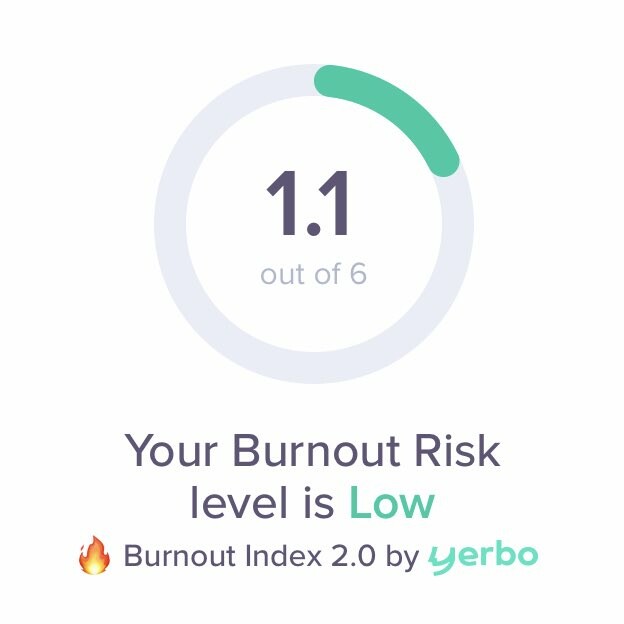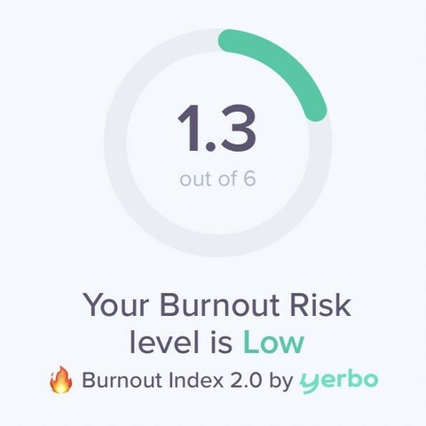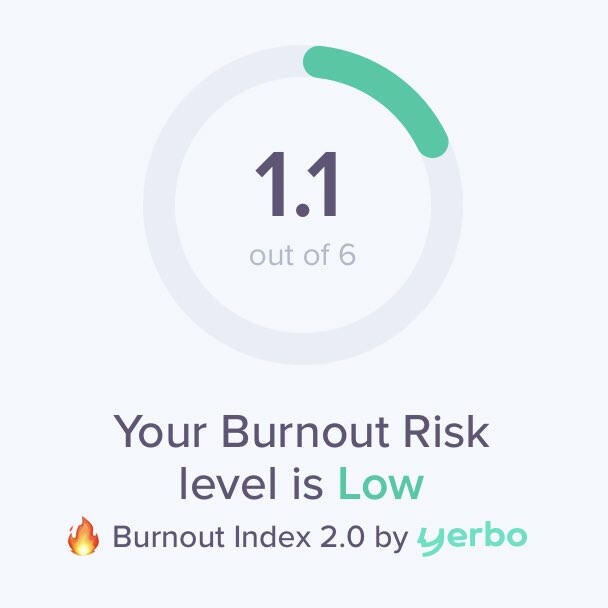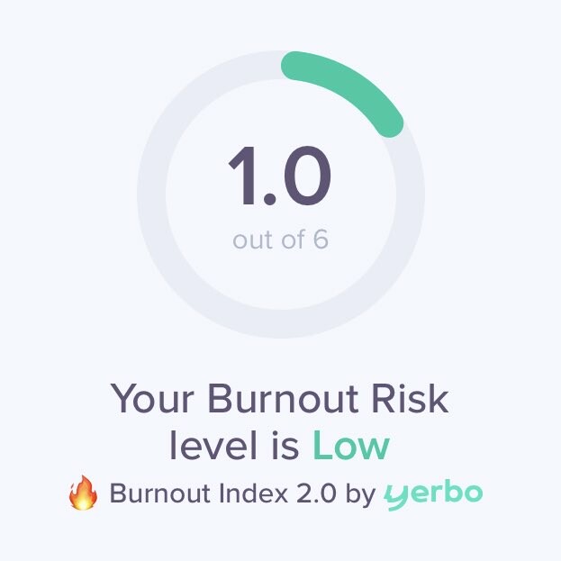 Back at work this week and still maintaining low burnout. Also, had a delightful conversation today with @MarcosSponton@twitter.com about @yerbolabs@twitter.com awesome tools! #fightburnout ๐ฅ