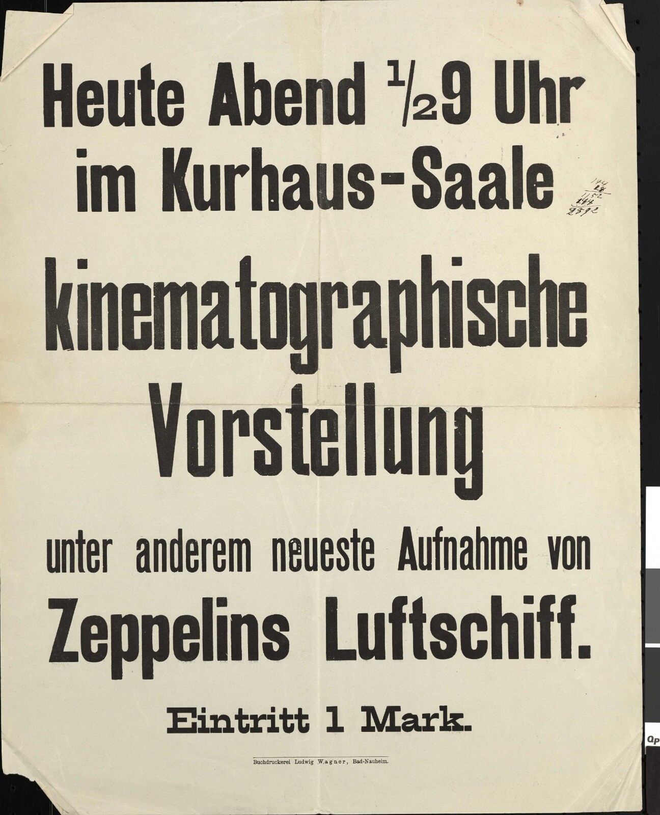 Geräte zur Aufnahme und Betrachtung von bewegten Bildern wurden in der zweiten Hälfte des 19. Jahrhunderts entwickelt, im frühen 20. Jahrhundert waren öffentliche Filmvorführungen an der Tagesordnung. Die ersten #Filme waren sehr kurz und zeigten vor allem Alltagsszenen oder gesellschaftliche Ereignisse. Im Kurhaus-Saal in Bad Nauheim wurden um 1900 im Rahmen einer „kinematographischen Vorstellung“ Aufnahmen von Zeppelins Luftschiff gezeigt (HStAD, Bestand R 2 Nr. 5524: https://arcinsys.hessen.de/arcinsys/detailAction?detailid=v1420324).